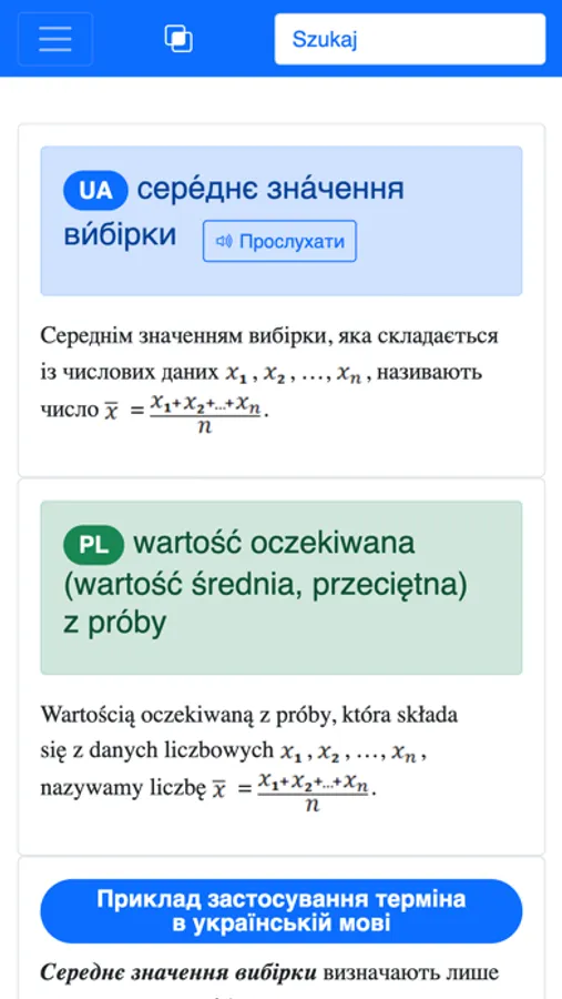 Bezpłatny polsko-ukraiński słownik terminów matematycznych z programu szkolnego klas 1-11. Przydatny, niezbędny asystent dla uczniów uczących się w klasach z polskim językiem nauczania. Wygodna wyszukiwarka pozwoli Ci szybko znaleźć żądany termin i posłuchać jego wymowy w języku ukraińskim, poznać jego znaczenie i zobaczyć przykłady jego użycia w zdaniach.