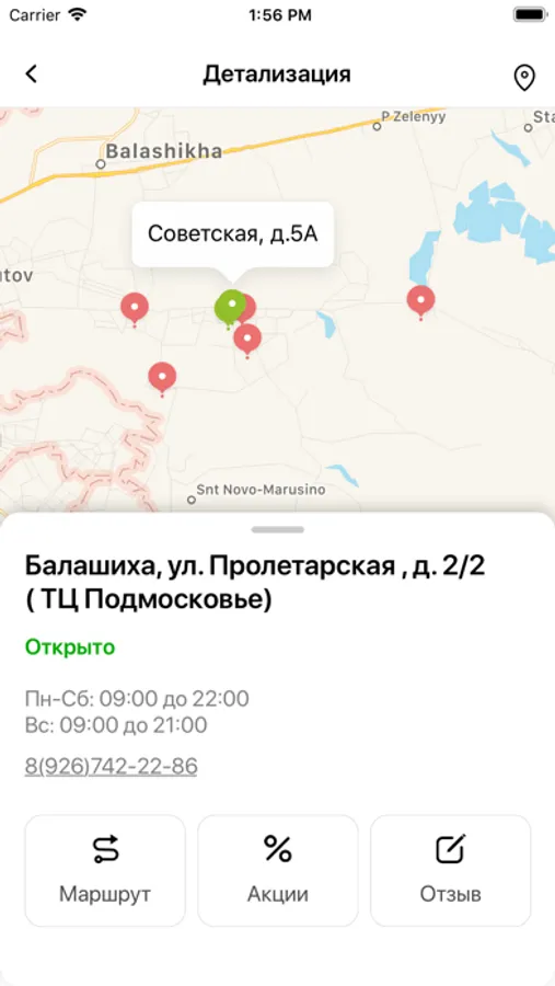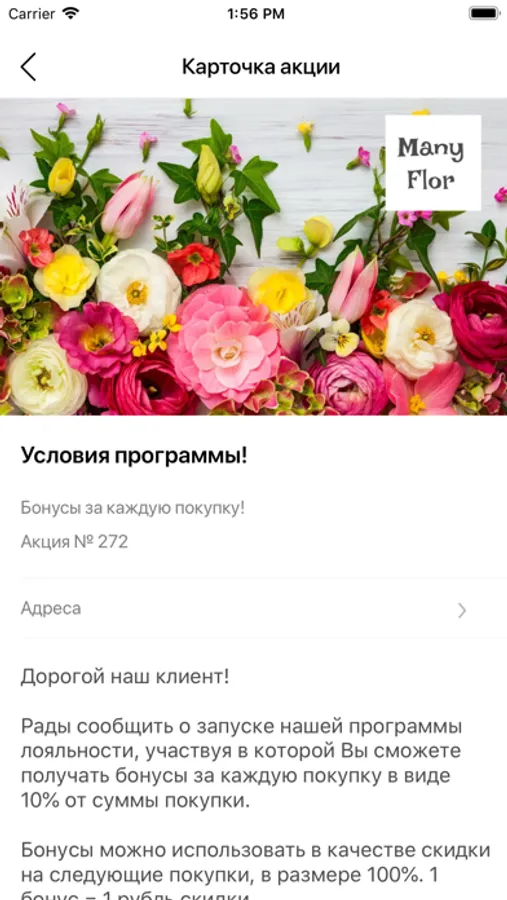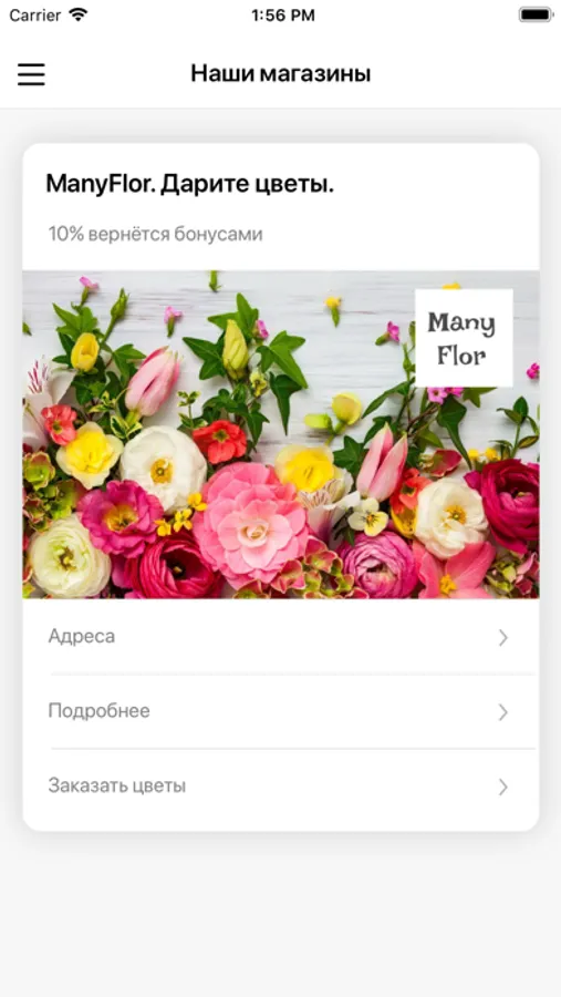 Приложение реализовано для клиентов сети цветочных салонов Many Flor, в г. Балашиха.