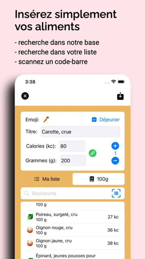 100 grammes facilite la tenue d’un journal calorique à partir d’une base d’aliments. Vous pouvez ajouter de nouveaux aliments ou plats à votre liste pour une réutilisation facile. Vous pouvez scanner les codes barres d’aliments afin de récupérer leur nom et leur densité calorique automatiquement.