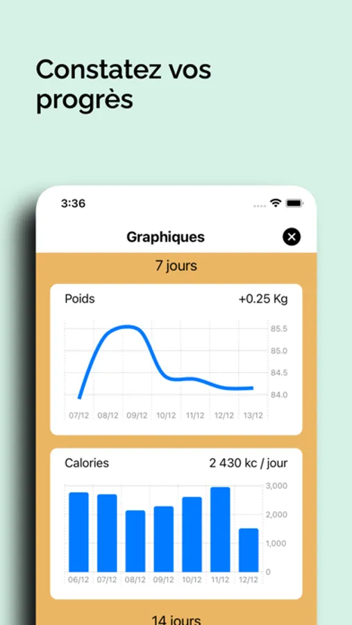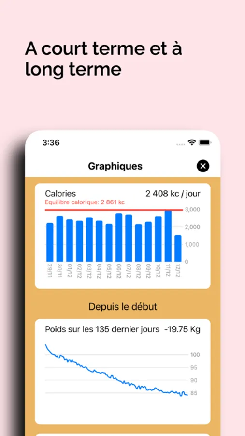 Lorsque vous avez une historique de données suffisante, vous avez accès à des graphiques historiques de votre poids, comparés à votre consommation calorique.