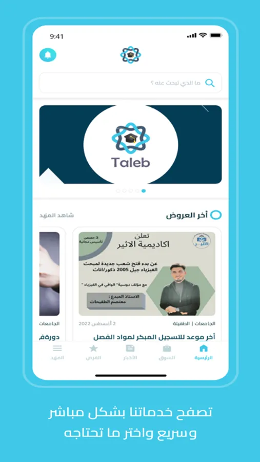 A platform provides a smooth learning environment for students, institutions, universities, and educational centers, where the student can search, inquire, and benefit from educational resources that are published through the Taleb platform.