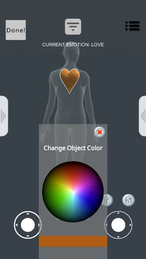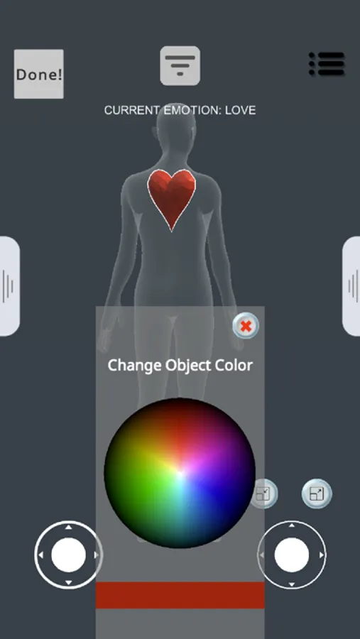 Joystick to modify the position of placed objects within the selected 3D body map in 6 degrees of freedom