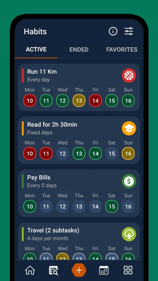 Create habits for a variety of distinct categories, each with specific goals set to your choosing.