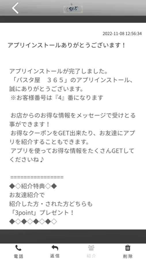 パスタ屋365のアプリをSNSを通じてお友達に紹介する事ができます。