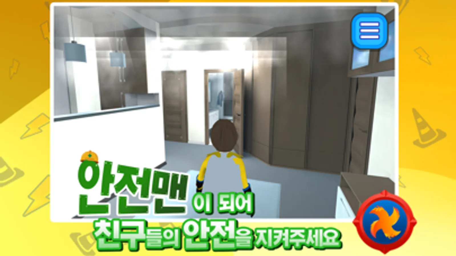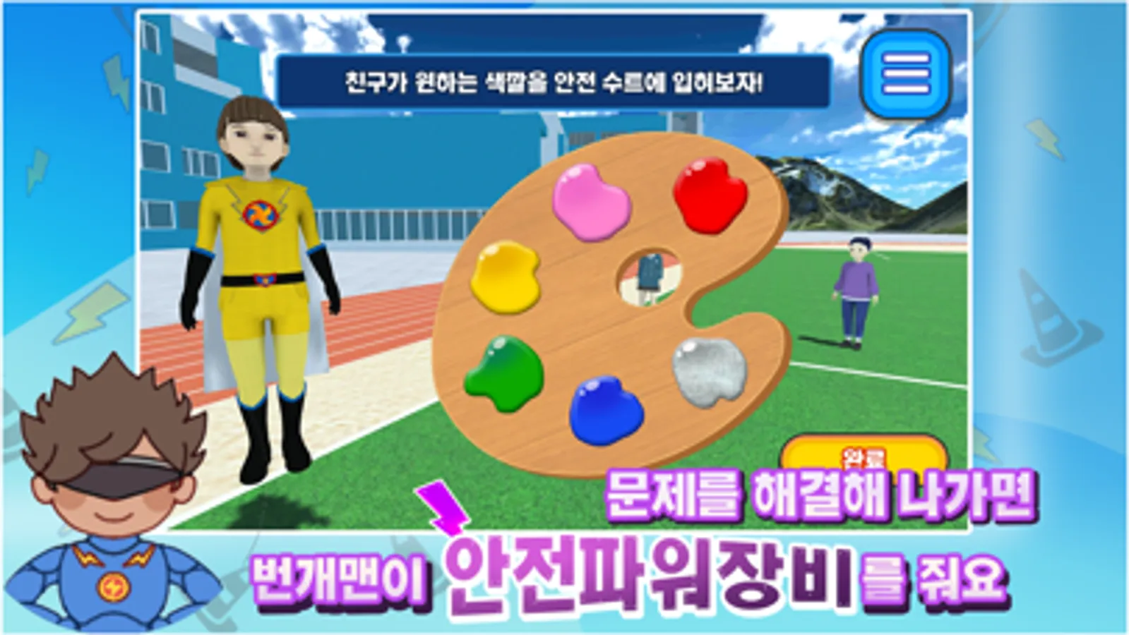 안전 문제를 풀어나갈 때마다 번개맨이 안전 파워 장비 줘요