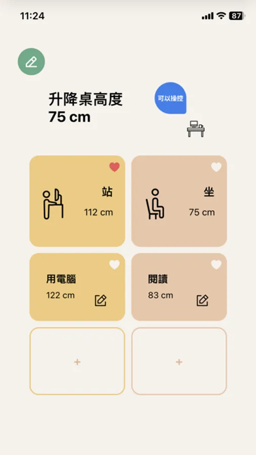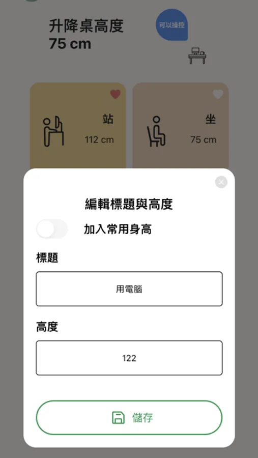 可設定常用記憶高度,點擊預設快捷鍵,讓升降桌調整高度