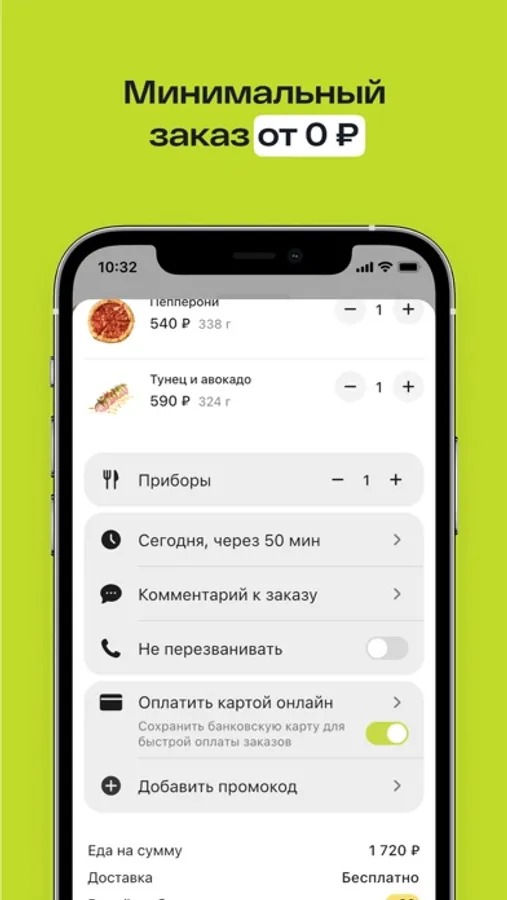 Доставляем быстро, минимальный заказ от 0₽. Через пуш-уведомления сообщаем, когда приедет курьер.