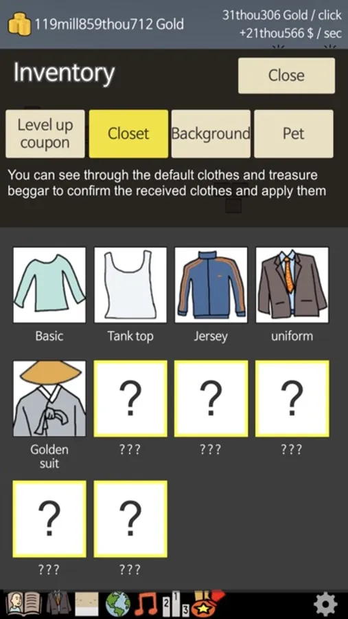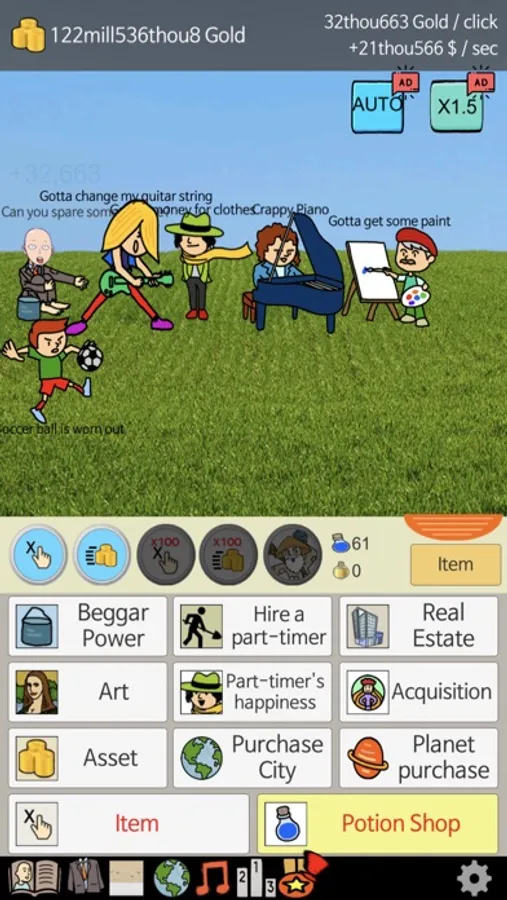Imagine that you are the CEO who is handling the Beggar Company, your job is to increase your management skill for taking more money and gold per click!