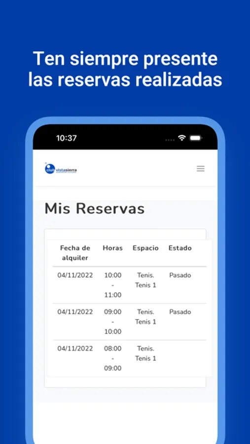 Con ésta app, el socio podrá seleccionar el día y la hora en la que querrá reservar el espacio deportivo. Además el usuario dispondrá de un listado con todas sus reservas realizadas.