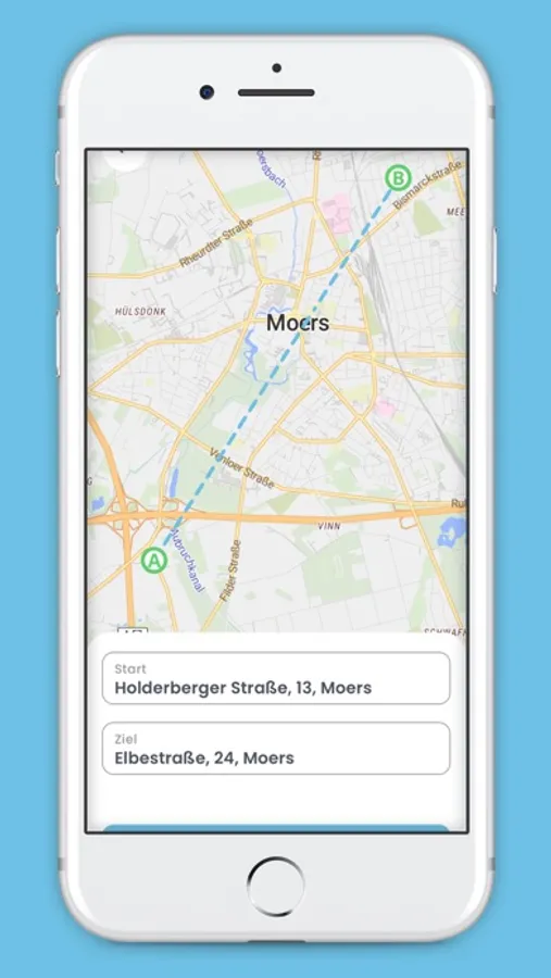 Nach dem Einrichten können ODI-Kundinnen und Kunden ihre Fahrtanfrage formulieren, indem sie in der App ihren Start-und Zielwunsch nennen. Die Nennung ist als konkrete Adressangabe möglich sowie durch Kennzeichnung in einer Karte.