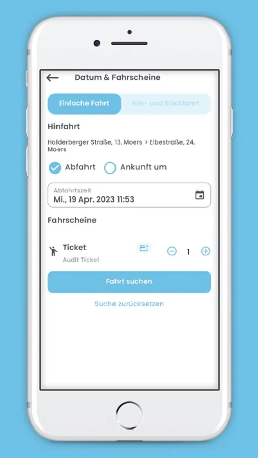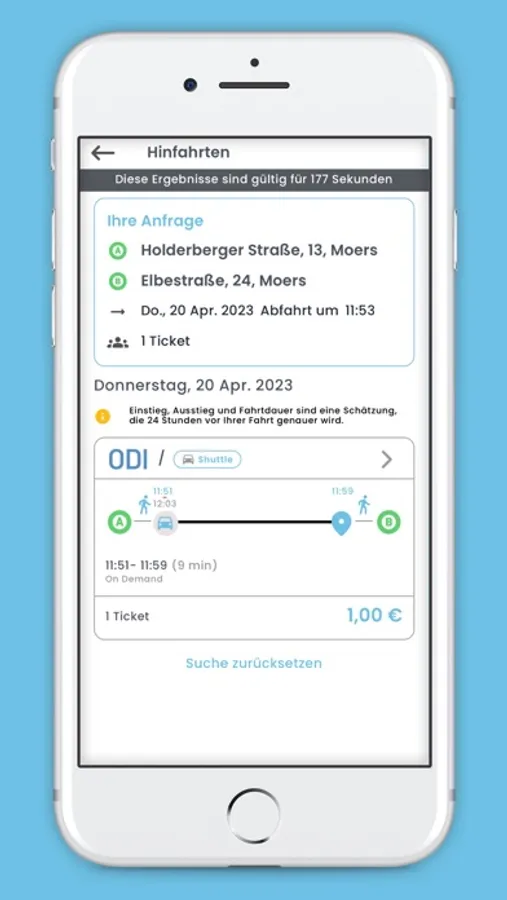 Einfach registrieren und schon kannst du mit wenigen Klicks den gewünschten Start- und Zielbereich sowie die gewünschte Bezahlweise angeben. Die ÖPNV-Zuschläge für eine Fahrt mit ODI werden kostengünstig kilometergenau & in Luftlinie nach VRR-On-Demand-Tarif berechnet.
