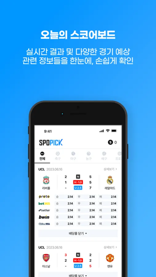 실시간 라이브스코어 및 간단한 경기 예상 관련 정보들을 한눈에, 손쉽게 확인하실 수 있습니다.