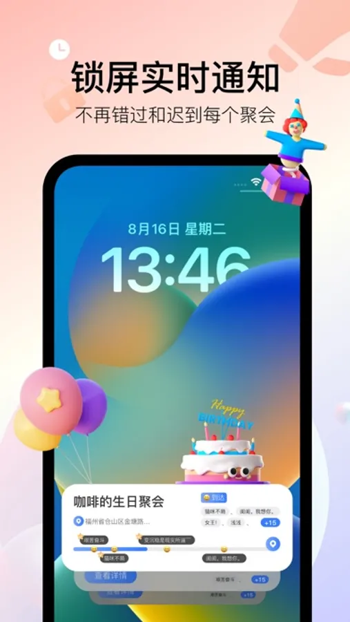 · 锁屏上展示实时路程,只需要在APP内新建聚会,邀请好友加入,聚会开始前锁屏展示大家的路程进度