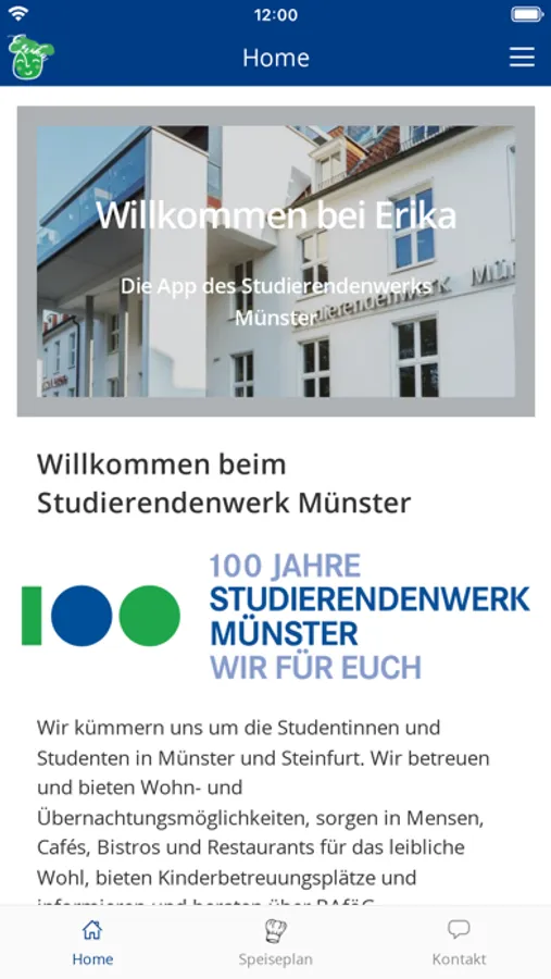 Seit 100 Jahren helfen wir Studierenden in Münster und Steinfurt, ihr Studium bestmöglich zu absolvieren. Mit unserer App ERIKA informieren wir Sie über alle unsere Dienstleistungen rund ums Studium: Was gibt es in unseren Mensen und Bistros zu essen? Welche Fristen müssen Sie für Ihren BAföG-Antrag beachten? Wo sind noch Plätze in unseren Wohnanlagen frei? Welche Veranstaltungen bieten wir für Studierende? Alle Stellenanzeigen, Informationen über unsere Aktionen und noch viel mehr: Das alles bietet Ihnen unsere App ERIKA.