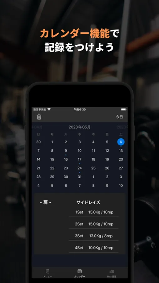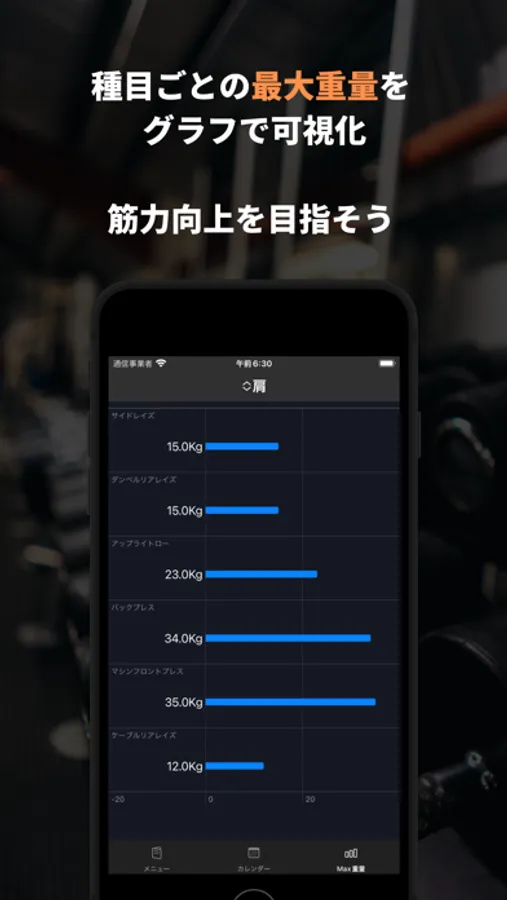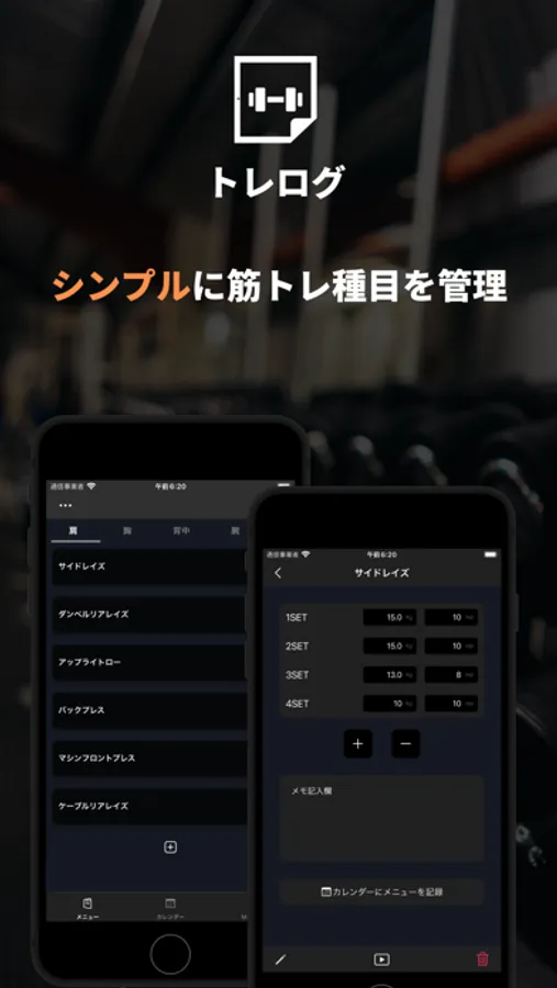 部位別(肩、胸、背中、腕、脚、その他)にメニュー管理