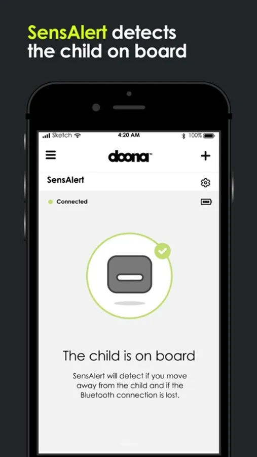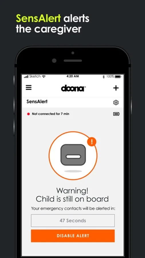 The Doona App connects to SensAlert, the only child car seat alert solution with 3 alert levels. SensAlert detects the child on board and warns the parent or caregiver with three incremental levels of alarm if the child is left unattended in the car. If the alerts are not disabled, SensAlert will contact up to 5 emergency contacts that you have defined in the app.