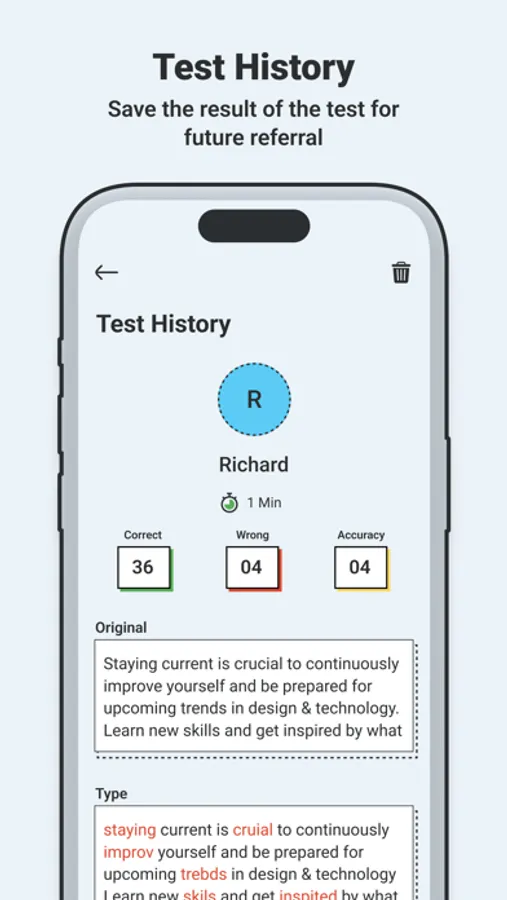 Have enough command of typing ! Then we recommend you to give test of typing. In typing section we provide different time duration of exam , you can save your results at the end of exam. You can visit to typing history section and see your results with word you typed , correct word and accuracy.