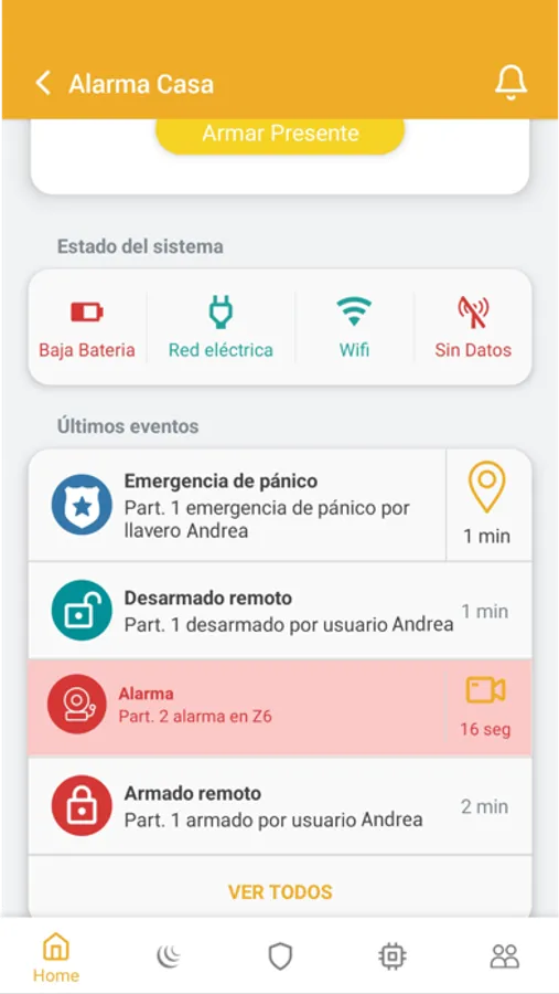 • Últimos 4 eventos con información de video verificación en caso de alarma y minutos transcurridos desde la generación del suceso.