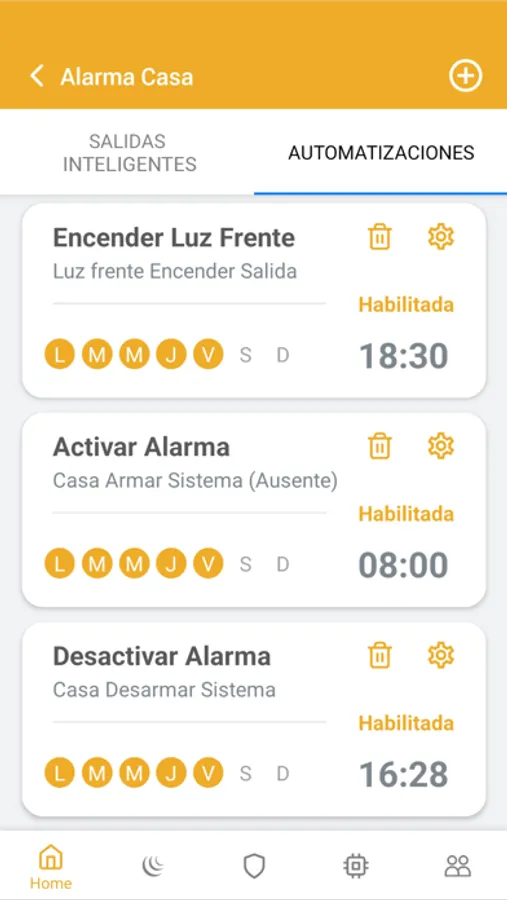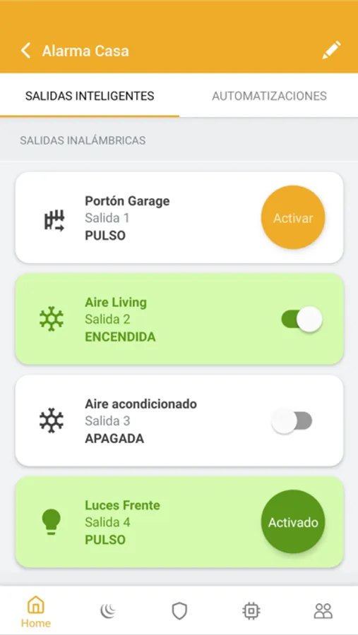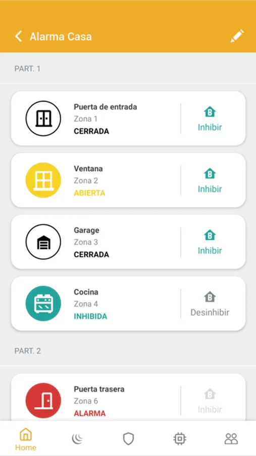 Esta sección de la app permite ver el estado de zona (abierta, cerrada, inhibida o en alarma) con sus colores característicos para una mejor y rápida identificación. Cada zona admite la personalización del icono que se elige desde una amplia galería disponible.