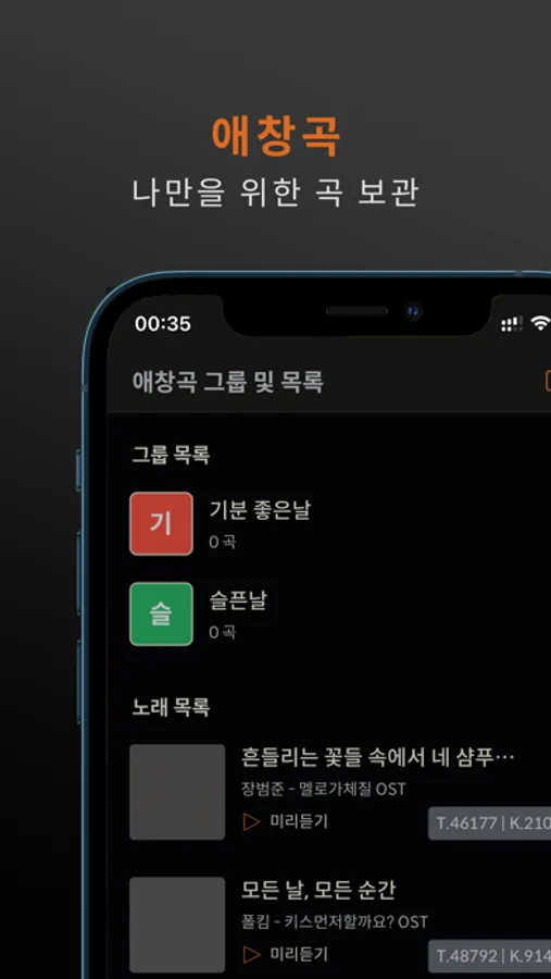 - 내가 좋아하는 애창곡을 그룹으로 모아보세요.