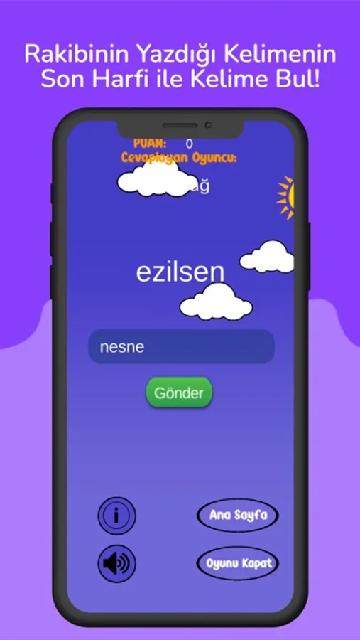 Rakiplerinizin kelimelerine karşılık son harfi ile başlayan kelimeler yazın. Yazdığınız kelimenin uzunluğuna göre puan alırsınız. Rakibiniz pes ettiğinde kazanırsınız.