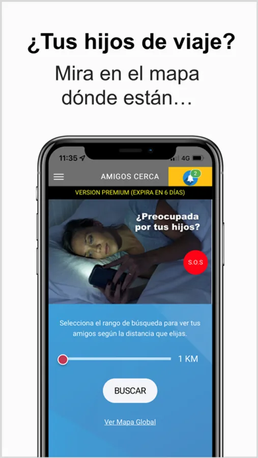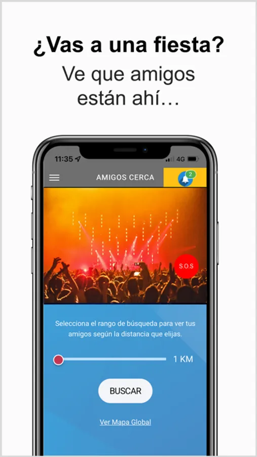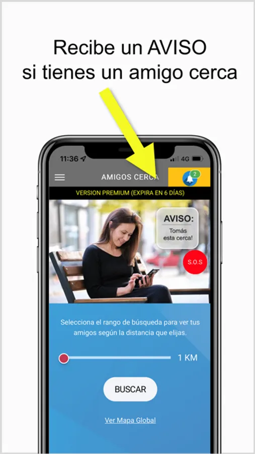 Cada vez que uno o más contactos entren al rango de 1 km la App PREMIUM te enviará un mensaje indicando que tu amigo está cerca de ti.