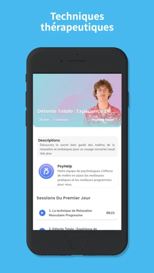 PsyHelp was designed in France by leading scientists and psychologists to make psychotherapy, particularly Cognitive Behavioral Therapy (CBT), accessible to all. In fact, science has shown that these techniques quickly produce results.