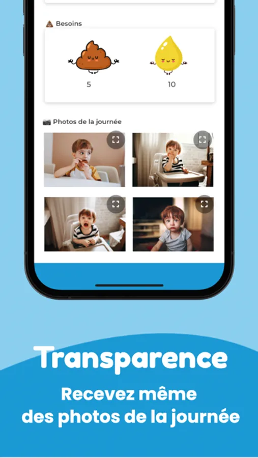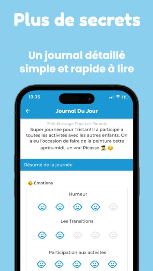 Journal de vie : Ce journal vous permettra d'avoir une vue d'ensemble de ce qui s'est passé durant la journée de votre enfant. C'est un moyen pratique pour les parents de rester informés et pour les assistantes maternelles de partager des informations claires et concises sur les activités de la journée.