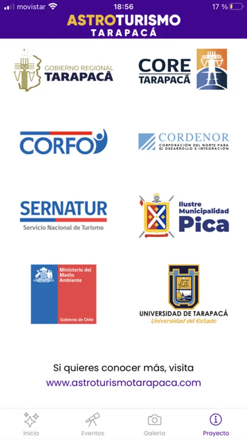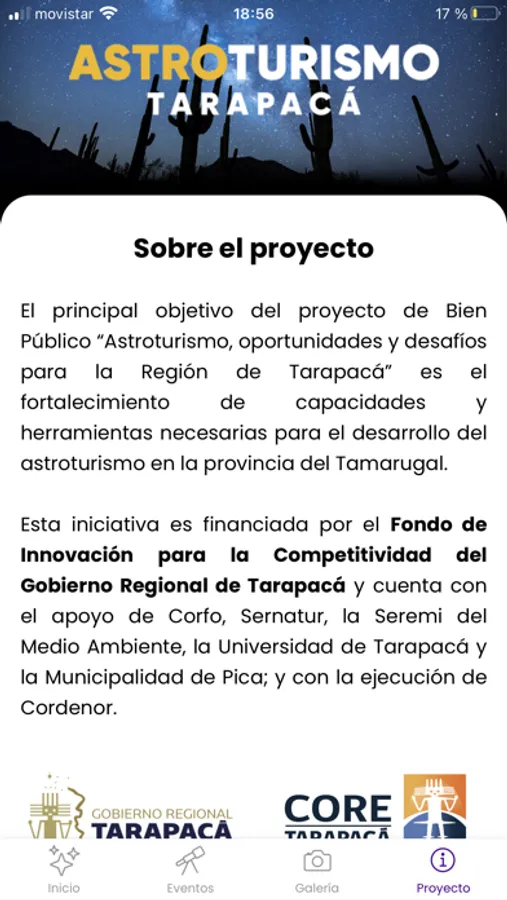 Esta aplicación es parte del proyecto de Bien Público "Astroturismo, oportunidades y desafíos para la Región de Tarapacá", iniciativa financiada por el Fondo de Innovación para la Competitividad del Gobierno Regional de Tarapacá.
