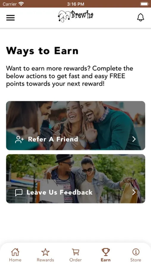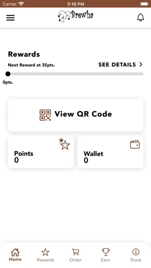 BrewHa Coffee House App - Earn and track your rewards at participating stores