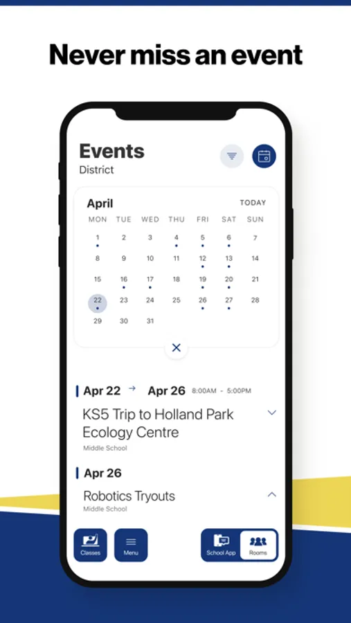 The event section shows a list of events throughout the district. Users can add an event to their calendar to share the event with friends and family with one tap.
