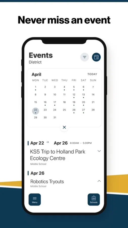 The event section shows a list of events throughout the district. Users can add an event to their calendar to share the event with friends and family with one tap.