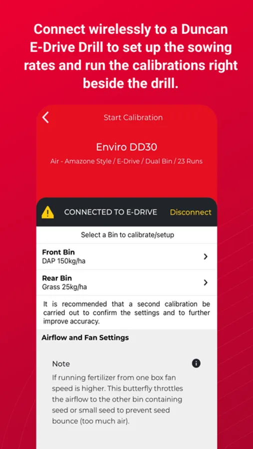 Connect wirelessly to a Duncan E-Drive drill to set up the sowing rates and run calibrations while you are right beside the drill.