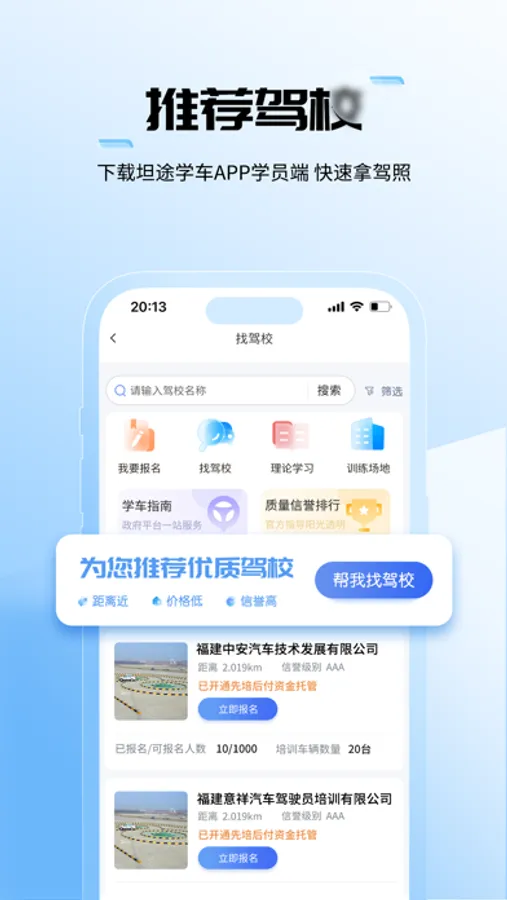 坦途学车是一款辅助驾考学员考试拿证的应用。你可以通过坦途学车查看自己的报名信息,跟进自己的培训进度,助力你尽快拿到驾驶证,为你的驾考之路保驾护航。