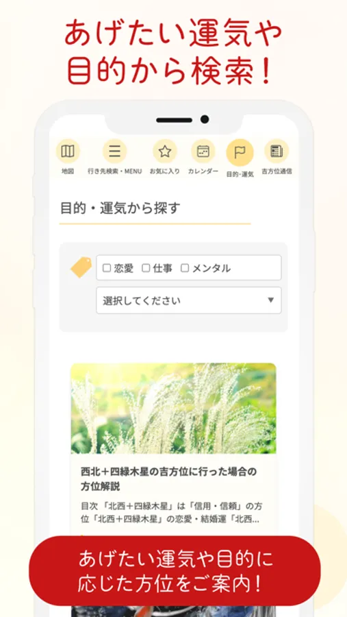「吉方位検索アプリ」とは、方位学という九星気学を使って、旅行や引っ越しによって開運する方位が調べられるアプリです。