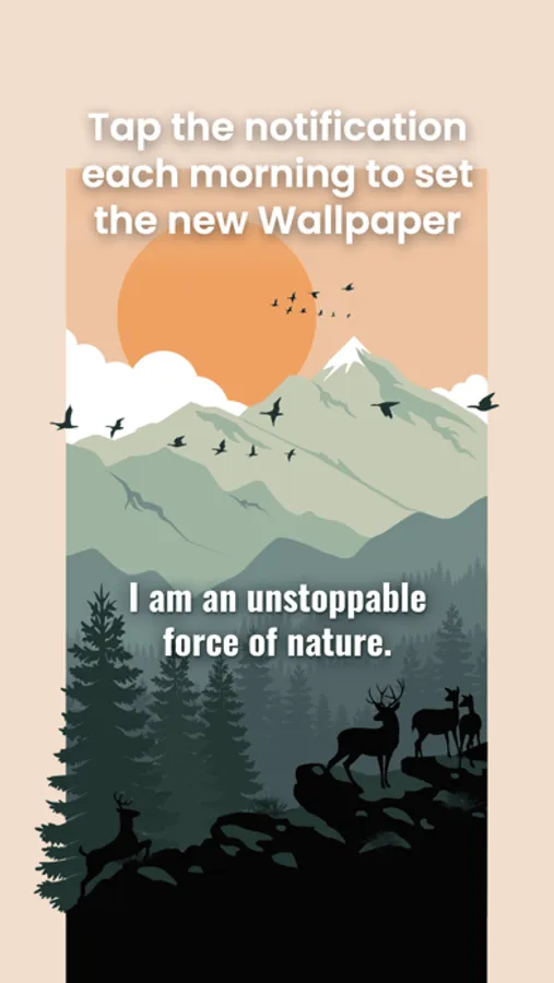 Each morning, you'll receive a notification with a new affirmation to inspire and motivate you. You can choose from three different wallpaper styles - the Daily Default, a Custom Background from our library of curated aesthetic options, or a photo imported from your own camera roll.