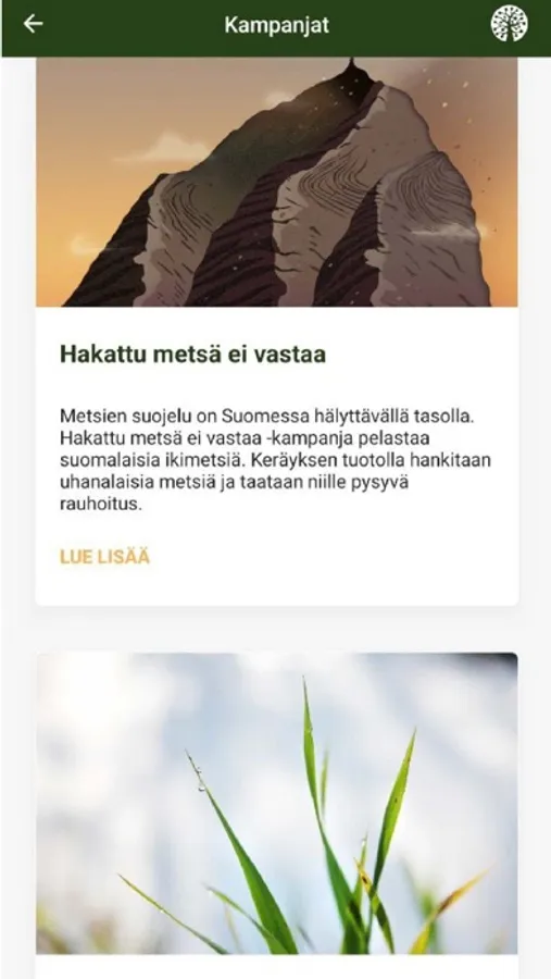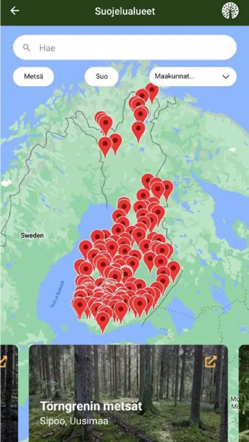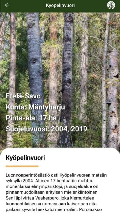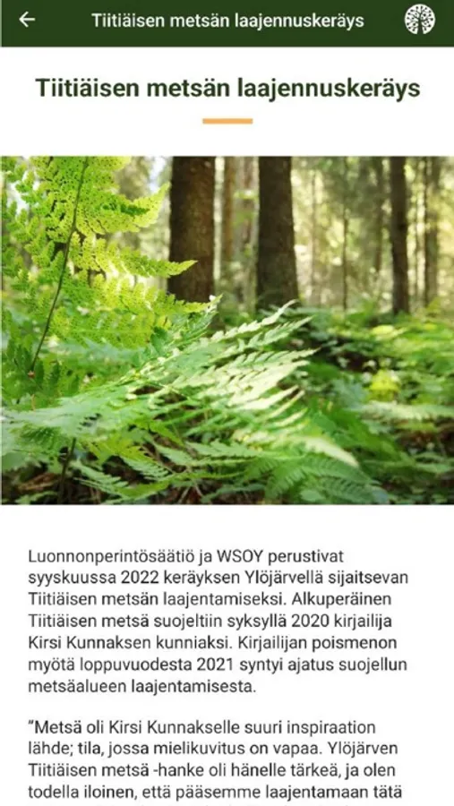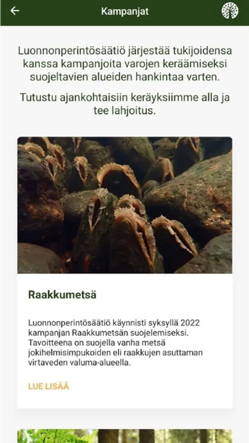 Luonnonperintösäätiö-sovellus tuo sinut lähemmäs säätiön suojelutyötä. Lue tuoreimmat suojelu-uutiset ja artikkelit, tutki suojelualueiden tietoja kartalla, osallistu kampanjoihin ja seuraa omaa lahjoitusprofiiliasi.