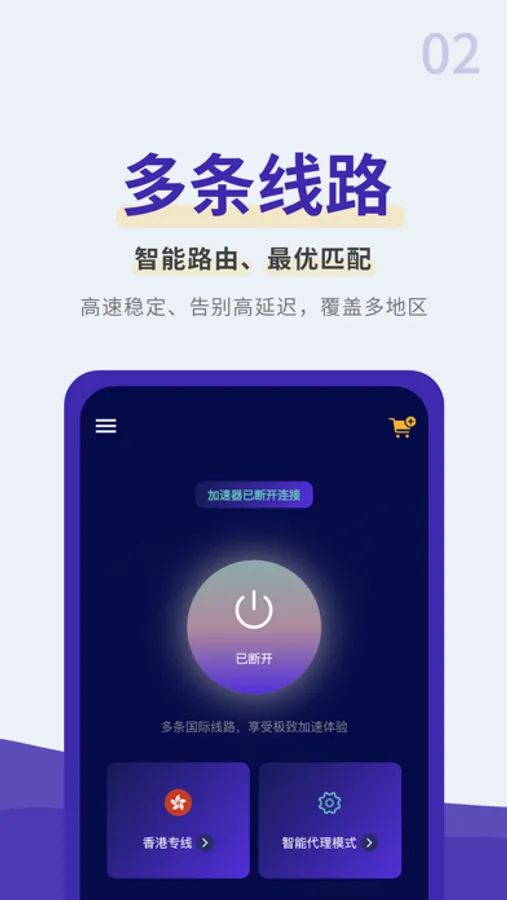 无需注册,即下即用,高速稳定,简单快捷;根据您的位置及网络状态,为您选择快速的加速线路,畅快体验。