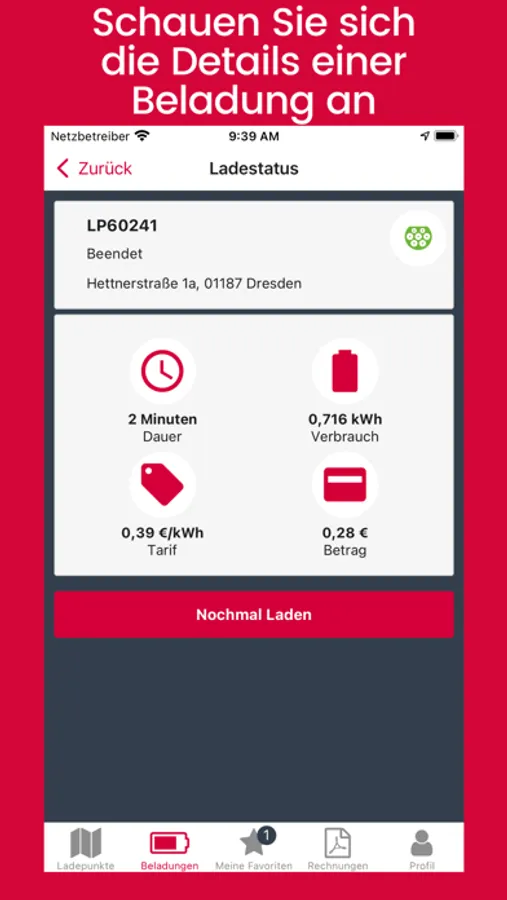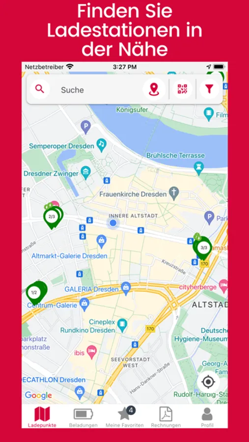 Scannen Sie einfach mit der App den passenden QR-Code an der Ladesäule oder wählen Sie Ihren gewünschten Ladepunkt auf der Karte aus. In der App können Sie mit nur einem Klick bequem den Ladevorgang starten, beenden und in Echtzeit verfolgen.
