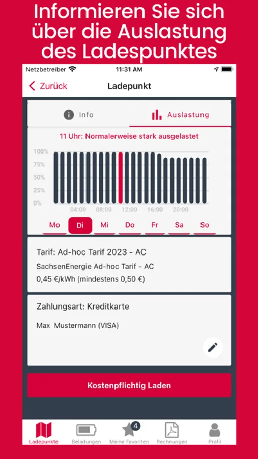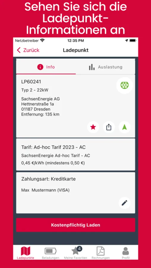 Sie können Ihr bevorzugtes Zahlungsmittel hinterlegen und bei künftigen Ladevorgängen direkt auswählen, ohne Ihre Daten erneut eingeben zu müssen. Sie haben die Wahl zwischen PayPal, SEPA, Visa, Mastercard und Ihrer Handyrechnung.
