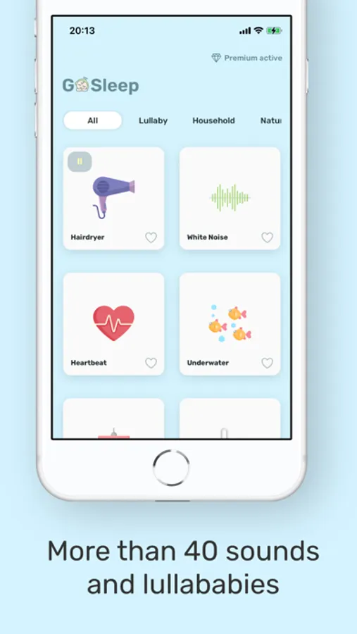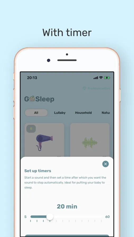 To start using GoSleep place your phone within audible distance of your baby but not too close to their head, choose one of the available sounds, set a timer and start playback.