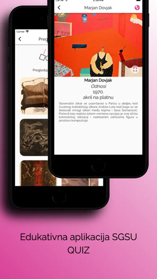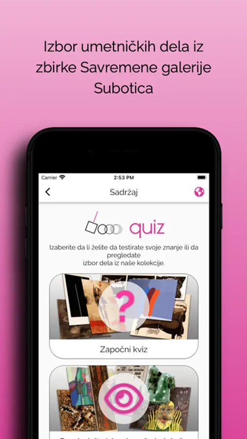 Mobilna aplikacija SGSU QUIZ je interaktivna aplikacija Savremene galerije Subotica, edukativnog karaktera. Aplikacija sadrži pregled izbora dela iz umetničke kolekcije Savremene galerije Subotica, kao i kviz pitanja kroz koja su komunicirane informacije o umetničkim delima i njihovim autorima. Galerija kolekcioniše umetnost od 1962. godine i čuva oko 1.500 dela, razvrstanih u četiri zbirke. Ova aplikacija je zamišljena kao početak upoznavanja sa tim vrednim umetničkim nasleđem i onima koji su ga stvarali.