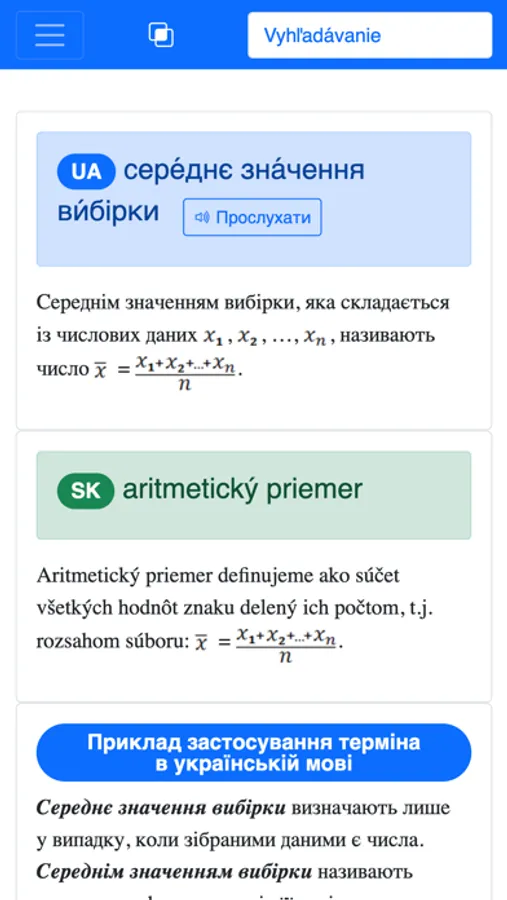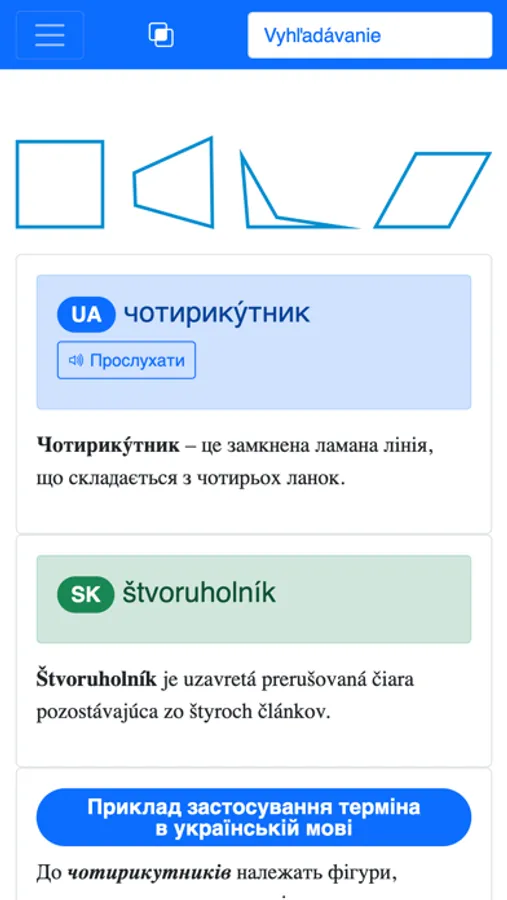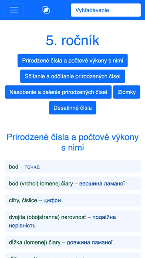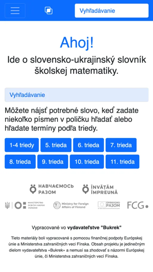 V slovníku môžete vyhľadávať výrazy v slovenskom aj ukrajinskom jazyku. Dá sa použiť samostatne počas domácich úloh a ako doplnkový zdroj na hodinách matematiky.