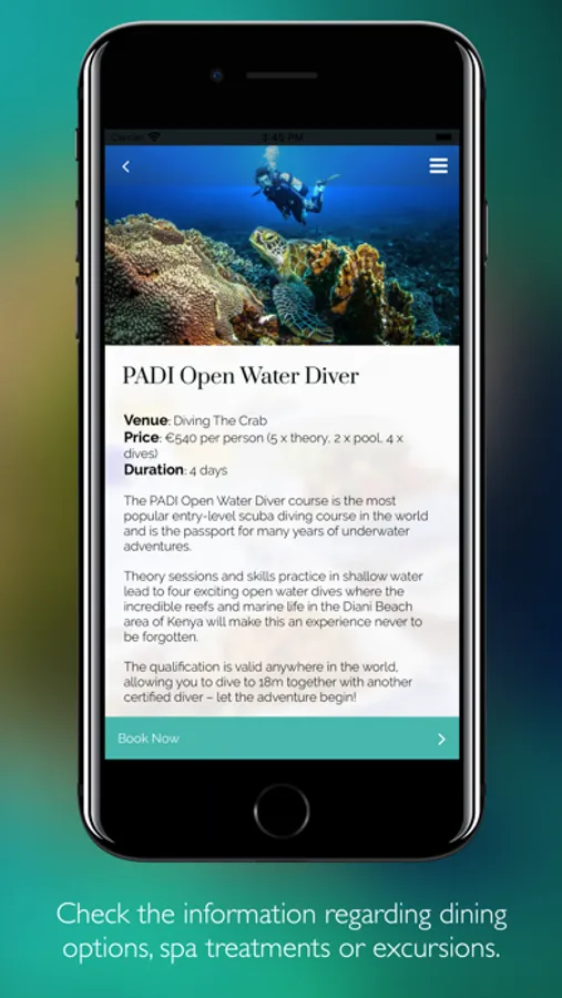 - Perfect your stay by booking restaurant tables, excursions and activities such as snorkelling, scuba diving or spa treatments;