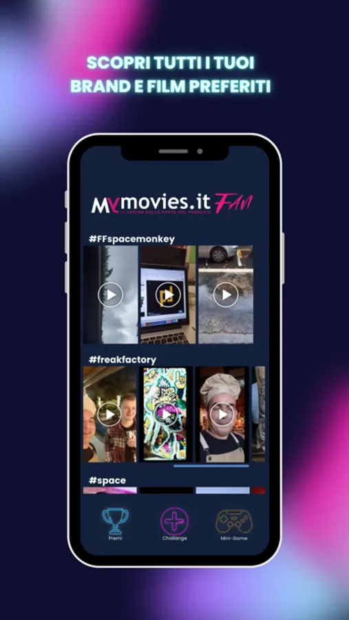 Un mondo di challenge dedicate ai fan del cinema. Ogni utente potrà divertirsi a compiere Challenge originali basate su film e brand legati ai più grandi film dì successo. Alcune saranno semplici, altre saranno così esclusive da utilizzare la realtà aumentata per scoprire la sfida. Challenge divertenti e mini-game a cui partecipare. I video più amati sui social e i più originali saranno premiati con premi unici.