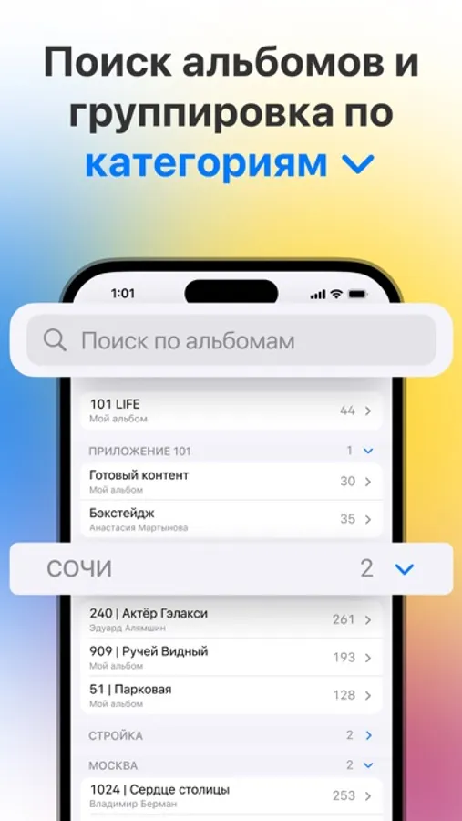 "101 Фото" избавит вас от рутины согласований и обсуждений. Создавайте альбомы, добавляйте фотографии, видео и теги, чтобы всегда иметь важные материалы под рукой. Совместно обсуждайте проекты, приглашая коллег в альбомы.