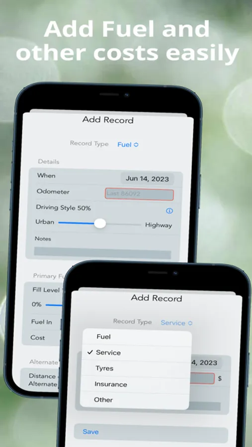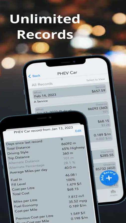 You can also log your services, tyres, insurance and other costs, for easy visualising in the Total Costs graphs.
