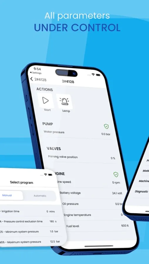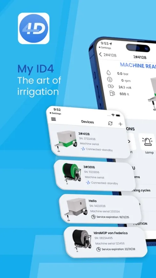 Access your ID4 devices and manage them as if you were in front of them. Program your irrigations with scheduled starts or automatic cycles; set its duration, working pressure, return speed, rainfall and everything you need for your irrigation.