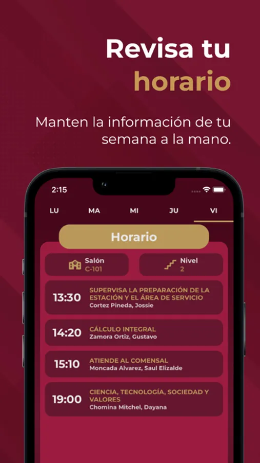- Observar tu horario escolar con todos la información que necesitas saber