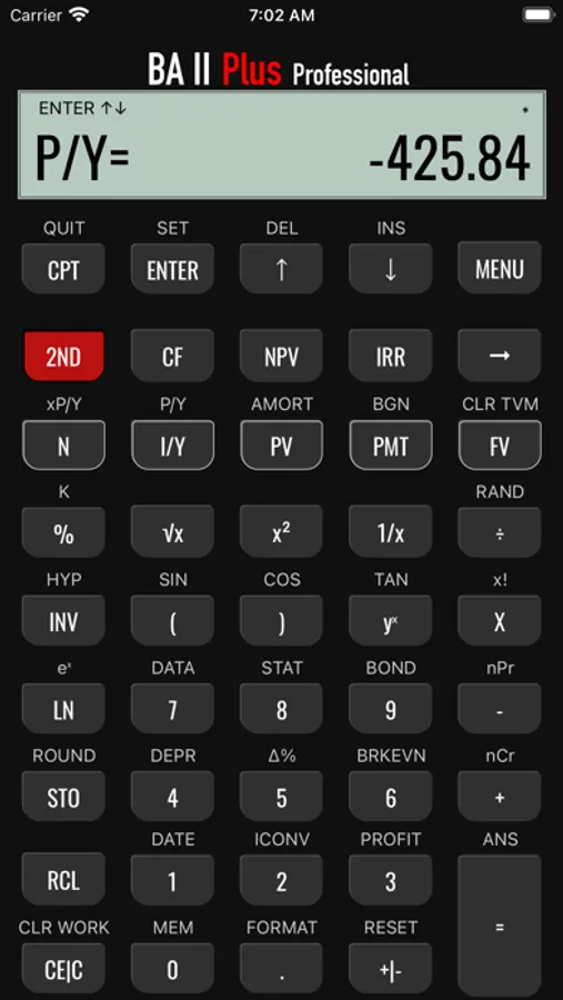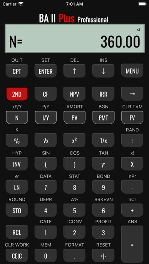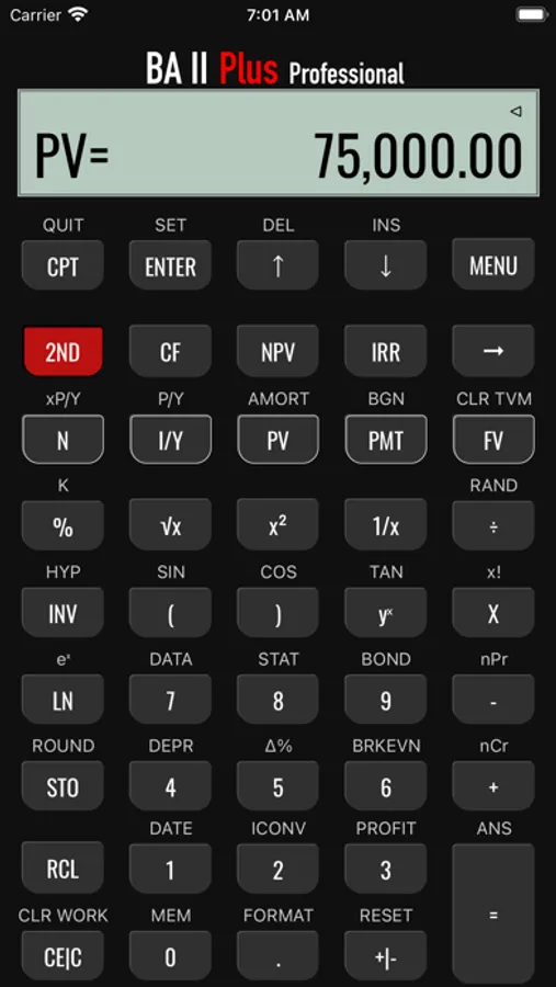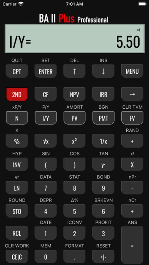 The BA II Plus Professional is a complete reimplementation of the full functionality of the TI's professional version of BA II Plus calculator. This free version provides basic Calculator functions, Math functions, Memory functions. A one-time In-App-Purchase required to access the Time-Value-of-Money (TVM), Amortization, Cash Flow, Bond, Depreciation, Statistics, Percent Change/Compound Interest, Interest Conversion, Date, Profit Margin, and Breakeven worksheets.